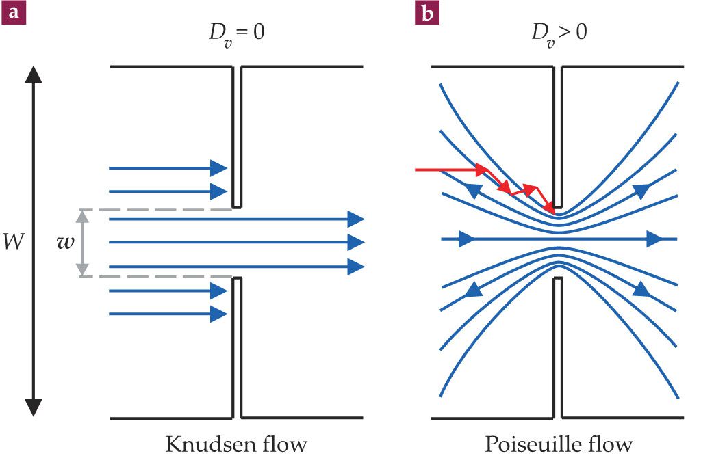 Electron flow through a constriction. A narrow aperture of width separates two wide leads. (a) In ballistic transport—Knudsen flow in the language of gas dynamics—electrons move independently. With no scattering between them, the resistance to their flow (blue) through the constriction had been expected to be a minimum. (b) In a viscous electron fluid, however, Poiseuille flow corresponds to yet lower resistance. An individual electron (red), initially directed toward the boundary, isn’t expected to contribute to the conductance. But collisions with other electrons effectively drag it toward the constriction and the collective motion decreases the resistance. The quantity is the length scale over which momentum diffuses as a result of electron–electron collisions. (Images from Marco Polini.)