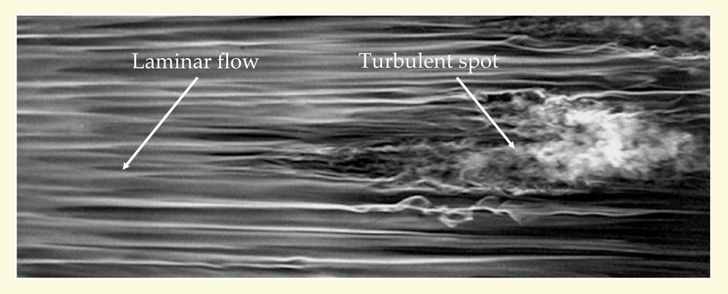 Figure 1 shows one common form of disturbance growth, a spreading patch of turbulence called a turbulent spot, in air flowing over a flat plate. Small velocity fluctuations in the flow far from the plate generate a turbulent spot near the plate’s surface. The spot grows with downstream distance until it encompasses the entire flow domain. In such a flow, bound on one side by a surface, turbulence is confined to a finitely thick region above the surface known as a boundary layer.