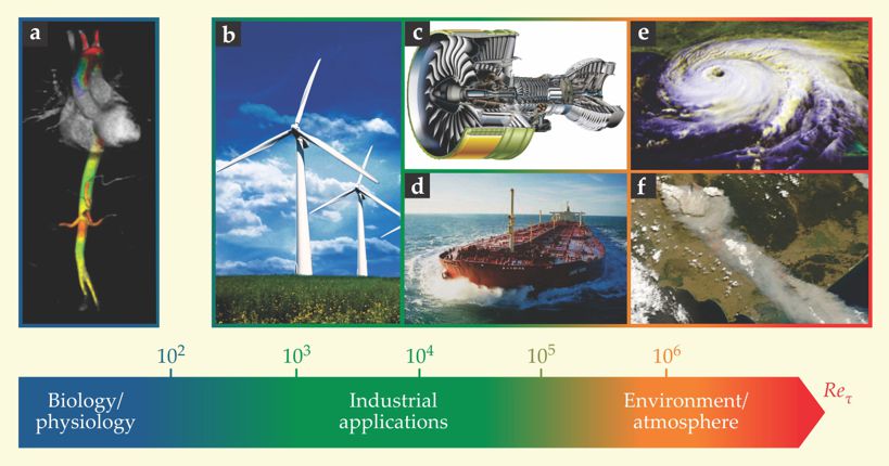 Figure 3. A turbulent flow can be characterized by a Reynolds number Reτ, commonly interpreted as the ratio of the flow’s largest and smallest length scales of motion. The real-world systems represented here—(a) human blood flows, (b) wind farms, (c) engines, (d) cargo ships, (e) hurricanes, and (f) atmospheric winds—span several orders of magnitude in Reτ. (Figure courtesy of Olivier Cabrit.)