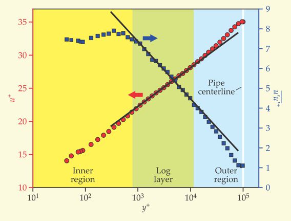 where both the inner and outer scalings apply. Using dimensional and overlap arguments, he showed that the mean velocity profile in the overlap region should follow a logarithmic law: u+ = κ−1 ln y+ + C, where the constant C depends on details of the flow, but κ, known as von Kármán’s constant, is thought to be universal. The result is the same one that was deduced by Ludwig Prandtl in 1925. (Here, we’ve nondimensionalized according to the inner-region length scale; an expression nondimensionalized according to the outer-region length scale takes a similar form.) Millikan’s result has received widespread experimental support.