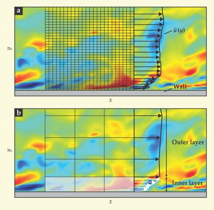 Figure 5. The grid spacing in a large eddy simulation must be fine enough to resolve all but the smallest length scales in a turbulent flow. In this simulated boundary-layer flow, red and blue areas indicate eddies, and the arrows indicate the mean streamwise velocity ū at various distances y from the wall. (a) For standard large eddy simulation, the necessary grid spacing is exceedingly fine due to the very small scales in the near-wall region. (b) A coarser grid can be used if the inner layer near the wall, shaded white, is described instead by an empirical model. (Adapted from ref. 7.)