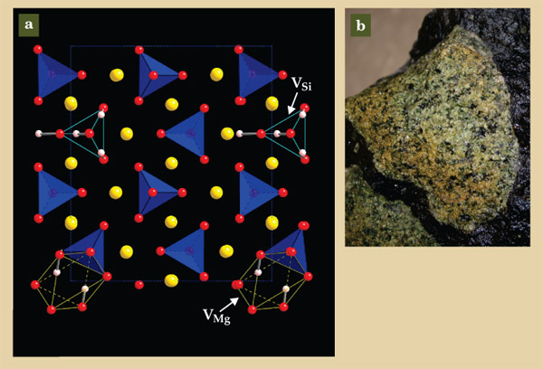 Figure 2. (a) The crystal structure of iron-free olivine, Mg2SiO4, also known as forsterite. Silicon ions sit at the middle of the blue tetrahedra; oxygen ions (red) sit at the corners. At a vacant Si site VSi, four H+ ions (white) can substitute for a single Si4+ ion. Alternatively, at a vacant Mg site VMg, two H+ ions can substitute for a single Mg2+ ion (yellow). (Adapted from ref.