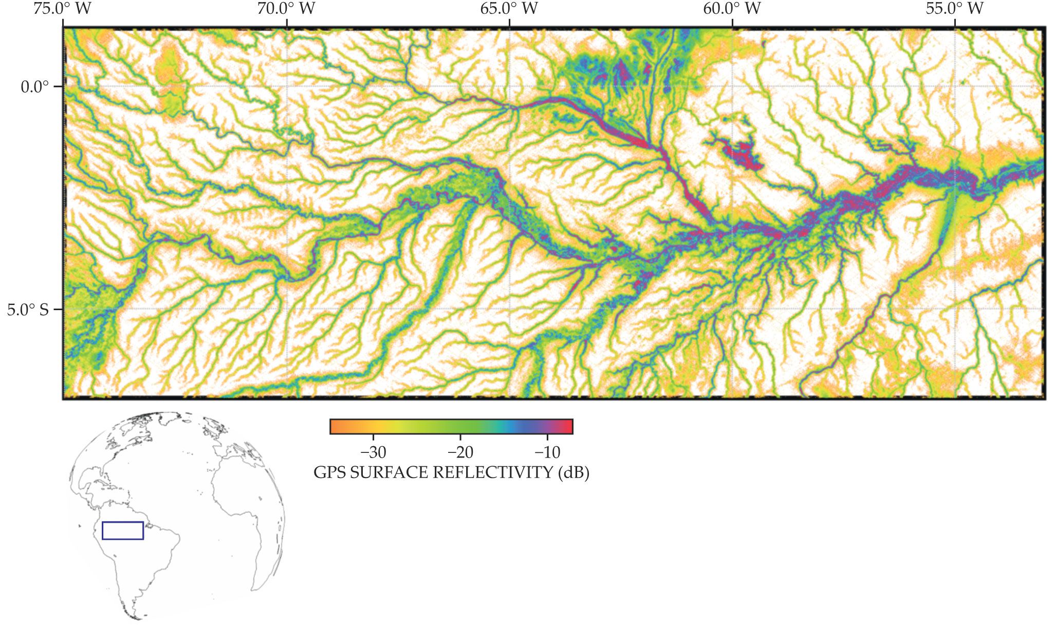 The Amazon River and many of its tributaries in South America appear in this long-term average of GPS-reflected signals recorded by the Cyclone Global Navigation Satellite System. Large, smooth bodies of water have higher values of surface reflectivity, though smaller tributaries still produce significant surface reflections.