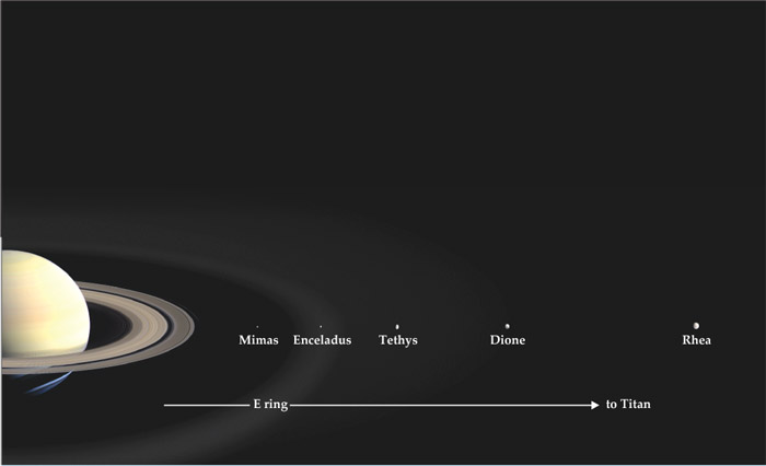 Figure 1. Enceladus and the four other midsize moons of the inner Saturn system are depicted in this artist’s conception, drawn to scale (though moon sizes are exaggerated for clarity). The diffuse E ring exhibits a spike in density at the orbit of Enceladus.