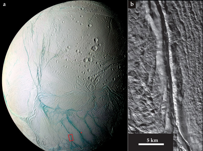 Figure 2. Tiger stripes. (a) This false-color Cassini mosaic of Enceladus displays a variety of landforms. The upper-right part of the 500-km-diameter disk shows some of the moon’s older, cratered terrain, whereas the upper left shows tectonically disrupted terrain of intermediate age. The lower part of the disk is occupied by the young south polar terrain; the red dot indicates the south pole. The four parallel bluish fractures surrounding the south pole are the active tiger stripes, source of Enceladus’s plumes. The blue color in the image arises because coarse-grained water ice absorbs the near-IR wavelength used, in part, to generate the mosaic images. The area bounded by the red rectangle is magnified in (b), a view of one of the most active parts of the tiger stripe Damascus Sulcus.