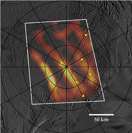 Figure 3. The most intense thermal emission near the south pole of Enceladus appears here as bright regions. The colored thermal map bounded by the white quadrilateral is made from Cassini observations of radiation at wavelengths of 9- to16-µm and has a resolution of about 10 km. It is superimposed on a higher-resolution mosaic of the tiger stripes. The black circles on the mosaic are separated by 10 degrees of latitude. The yellow stars mark the locations of the strongest ice particle jets seen in Cassini images, as reported in ref.