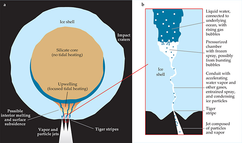 Figure 4. Enceladus in cross section. (a) In a possible structure for the interior of Enceladus, a liquid ocean separates the inner silicate core from the outer ice shell in the southern hemisphere. Enceladus’s tiger stripes are near the south pole; the region around one of them, delineated by the red rectangle, is magnified (but not to scale) in (b), which shows a possible path of water as it journeys from the liquid ocean, through a tiger stripe, and into space. (Panel a courtesy of Francis Nimmo.)