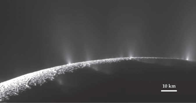 From our parochial point of view as biological entities, however, H2O is most interesting in its liquid form, which is essential for the maintenance of life on Earth. If life exists elsewhere, the best places to look for it are those with liquid water. Compared with ice and water vapor, liquid water is stable over a narrow range of temperature and pressure. So it is relatively rare in the solar system. But Jupiter’s large moon Europa has been a center of attention for planetary scientists since the late 1990s, when the Galileo orbiter discovered evidence for a global water ocean beneath Europa’s icy surface. More recently, the Cassini orbiter has revealed a place that not only probably hosts liquid water but also is obligingly launching fresh samples of that water into space for analysis by spacecraft instruments. That place is Enceladus—a moon of Saturn 500 km in diameter.
