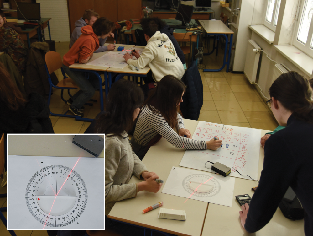 They set up an experiment (see figure 1) and measure the angles with respect to the normal line from the incident surface. The lab handout provides them with hints on how to find a pattern in the data by using trigonometric functions. They do their work on small whiteboards and share their findings with the rest of the class. Some of the groups come up with Snell’s law.