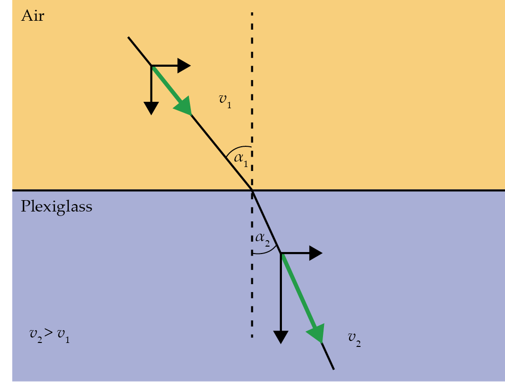 Explaining refraction with the particle model of light. Traveling at velocity v1 in air, a light particle enters a plexiglass slab at an angle of incidence α1. As the light enters the plexiglass, it refracts at an angle α2 that is smaller than α1. To explain that bending using the particle model of light, students hypothesize that when the light particle crosses the air–plexiglass boundary, the glass exerts an attractive force on the particle that causes an increase in the component of velocity perpendicular to the boundary. As a result, the light velocity v2 in the plexiglass will be faster than the light velocity v1 in air.