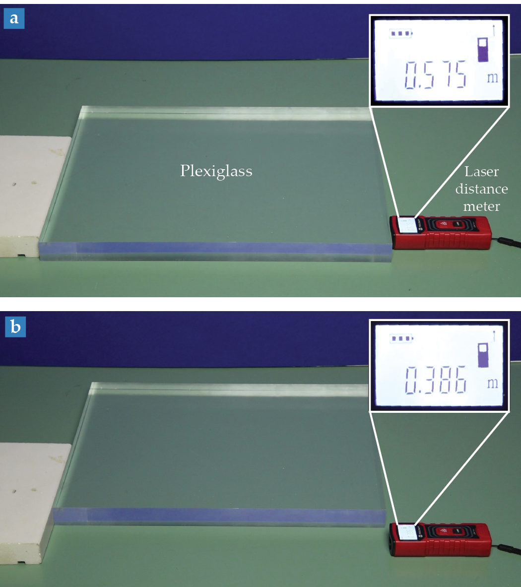 In an experiment, Investigative Science Learning Environment students use a laser distance meter (lower right corner of each panel, with insets of the readouts) to measure the distance traveled by light (a) in plexiglass and (b) in air. They then compare those speed-of-light measurements to determine in which one light travels faster.