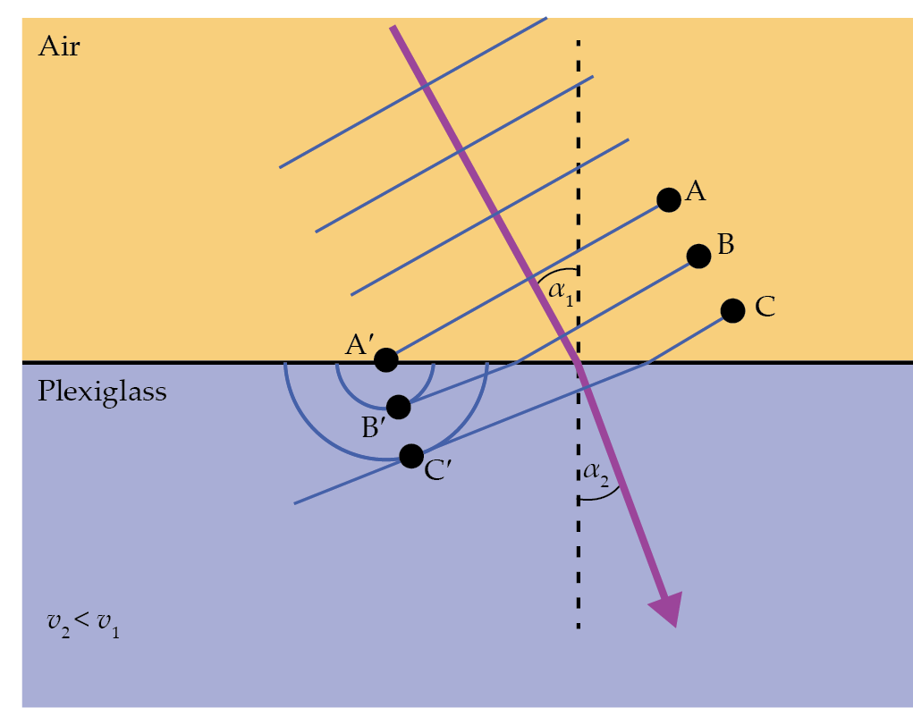 Explaining refraction with the wave model of light. Traveling at velocity v1 in air, a light wave enters a plexiglass slab at an angle of incidence α1. As it enters the plexiglass, the light refracts at an angle α2 that is smaller than α1. To explain that bending using the wave model of light, students hypothesize that once the points on a wavefront reach the air–plexiglass boundary, the radii of the circular wavelets that emerge from those points in plexiglass—according to Huygens’s principle—will be smaller than in air. The progression of wavefronts from A–A’ to C–C’ shows how they bend. That can happen only if the light velocity v2 in the plexiglass is slower than the light velocity v1 in air.