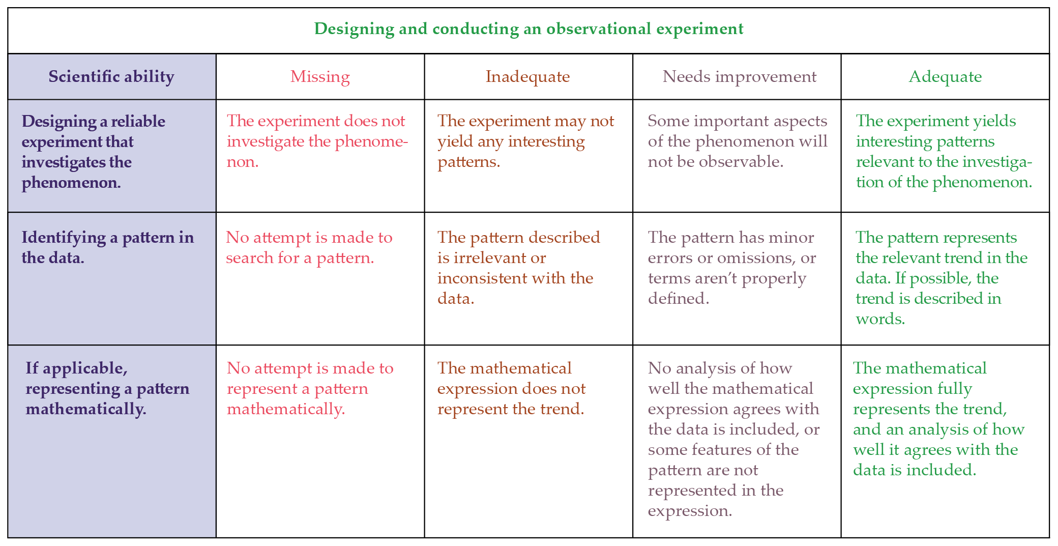 A selection of rubric criteria used by students to assess themselves when they design and perform observational experiments. The same criteria are also used by instructors to provide feedback.