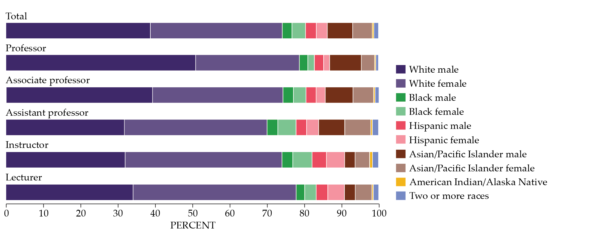 Faculty breakdown by gender, race, and academic rank is shown for the 1.5 million faculty who worked at degree-granting postsecondary institutions in the US in fall 2020. Of those, 56% were full time, and 44% were part time. At the higher, tenured ranks, white men were better represented than white women and all other groups, but the gender breakdown among nonwhite faculty members is more even than among white ones. Women were equally or better represented than men at the assistant professor level and in the non-tenure-line, lower-ranked positions of instructor and lecturer. (Fast Facts, “Race/ethnicity of college faculty,” 2022, https://nces.ed.gov/fastfacts/display.asp?id=61.)