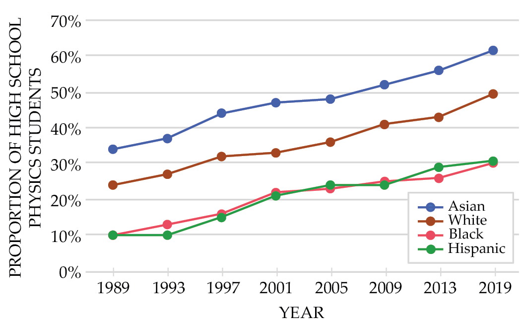 The proportion of students in different racial and ethnic groups that have taken high school physics in the US. (Adapted from ref. 11.)