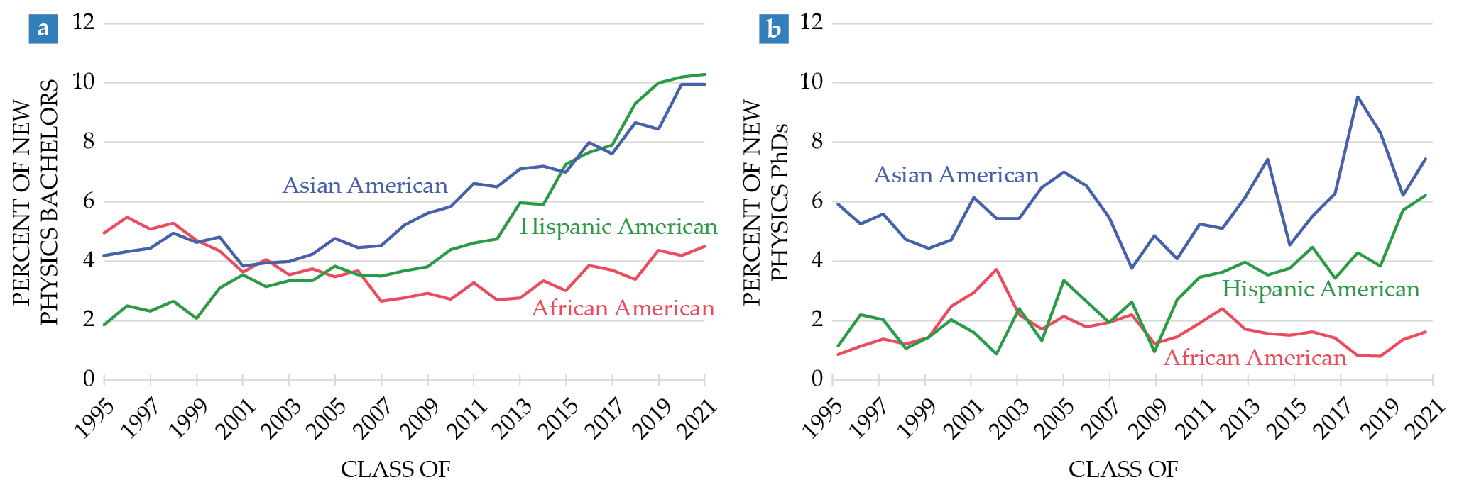 Figure 2 further illustrates the continued underrepresentation of people who are Hispanic/Latino and Black/African American at higher levels in the physics educational system. For the class of 2021, Black/African American students earned just 4% of physics bachelor’s degrees, and Hispanic/Latino students earned about 10% of physics bachelor’s degrees. But the approximate representation of people from those two groups in the US population is 14% and 19%, respectively.