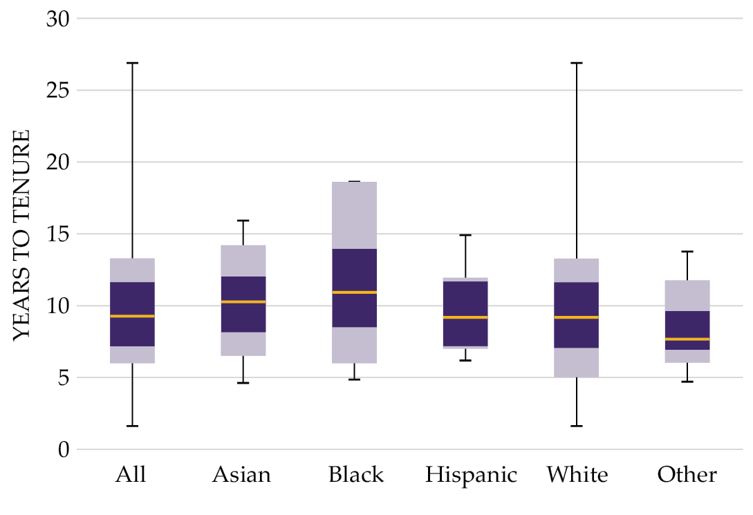 Unfortunately, our quantitative analysis can go no further in specifying the exact causes of the differences in time to tenure. There could be several reasons a faculty member receives tenure later than colleagues. For example, some faculty members could make a request or be encouraged to submit their materials later without a formal “stop the clock” process. The latter “encouragement” may be well-intentioned but could be a result of unconscious biases about the abilities of faculty who are members of minoritized racial and ethnic groups.