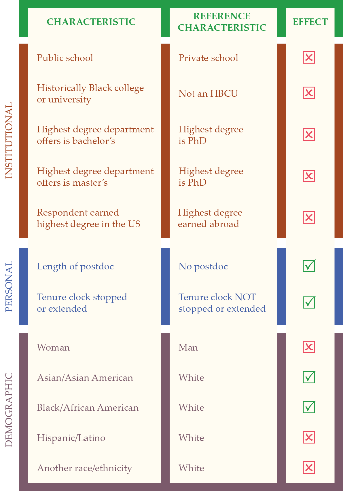 Multiple factors—including institutional (orange), personal (blue), and demographic characteristics (purple)—could affect how long it takes a faculty member to receive tenure. In our multivariate analysis of faculty survey data, we compared each characteristic in the first column with the reference characteristic in the second column. The green check marks in the third column show which factors had an effect on time to tenure.