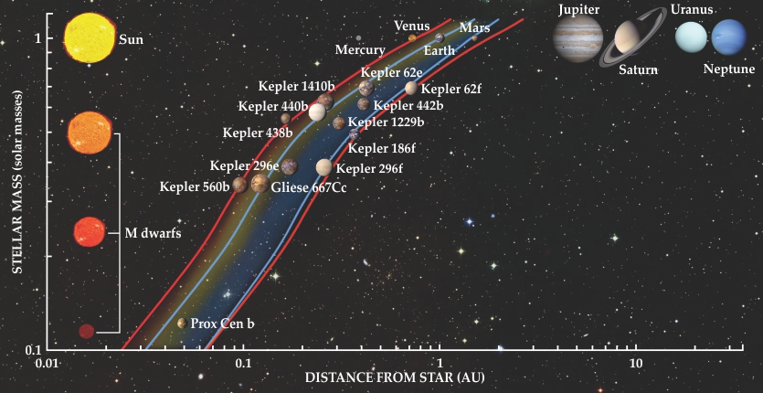 Figure 1. The habitable zone, that just-right range of orbital distances around a star that can support liquid water on a rocky surface, lies farther out from a star the more massive, and thus hotter, the star is. Depicted are the planets of the solar system and a collection of habitable-zone exoplanets. Also shown are scaled illustrations of the Sun and three M dwarfs, the most common stars in the galaxy. The red lines represent optimistic estimates for the habitable-zone boundaries based on scenarios in which Venus and Mars were habitable in the past. The blue lines are more conservative estimates based on climate models. (Courtesy of Chester Harman.)