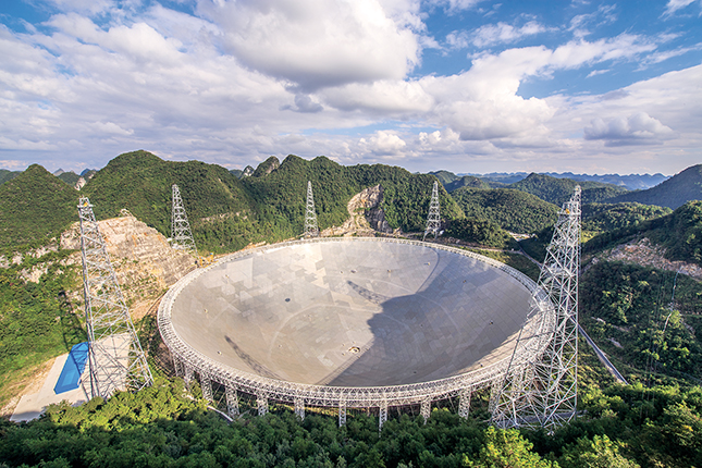 Figure 2. The world’s largest filled-in, single-dish radio telescope, the Five-Hundred-Meter Aperture Spherical Radio Telescope in Guizhou Province, China, entered its commissioning phase last September. Despite the telescope’s fixed gaze on a relatively small patch of the sky, the National Astronomical Observatory of China plans to use it to search for potential signals from intelligent life beyond Earth.