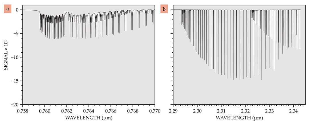 Figure 3. Abundant atmospheric oxygen is one of the most promising signatures of life on an exoplanet. One way to detect that oxygen is to measure the spectrum of a star with a planet in front and subtract the spectrum of the star alone. (a) This simulated O2 transmission signal for a hypothetical Earth-like planet transiting an M dwarf star gives cause for optimism. (b) The best fit model for the carbon monoxide signal observed for the hot Jupiter-like planet τ Boötis b is only three times stronger. (Adapted from ref. 10.)