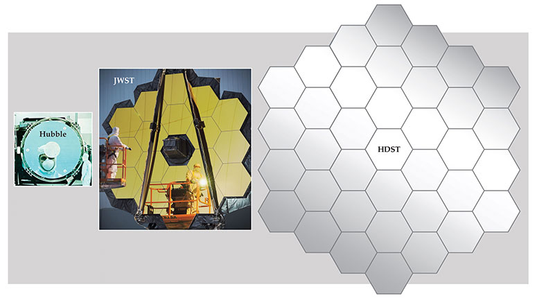 Figure 4. The proposed High-Definition Space Telescope (HDST) is to be equipped with an impressive 11.7-m-diameter primary mirror. In comparison, NASA’s James Webb Space Telescope (JWST)—to be launched in 2018— sports a 6.5-m-diameter mirror, and the Hubble Space Telescope a meager 2.4-m-diameter mirror. (Courtesy of NASA.)