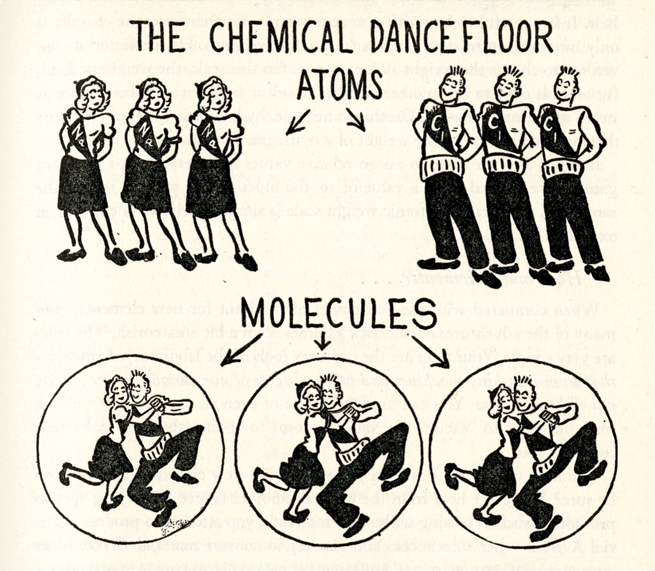 In many of his drawings, Sendak anthropomorphizes atoms, molecules, and subatomic particles to convey the otherwise esoteric details of nuclear science. Here, he shows sodium atoms, taking the form of young women reminiscent of 1940s bobby-soxers, and chlorine atoms, represented by strapping young men, meeting on the “chemical dance floor” and forming sodium chloride molecules.