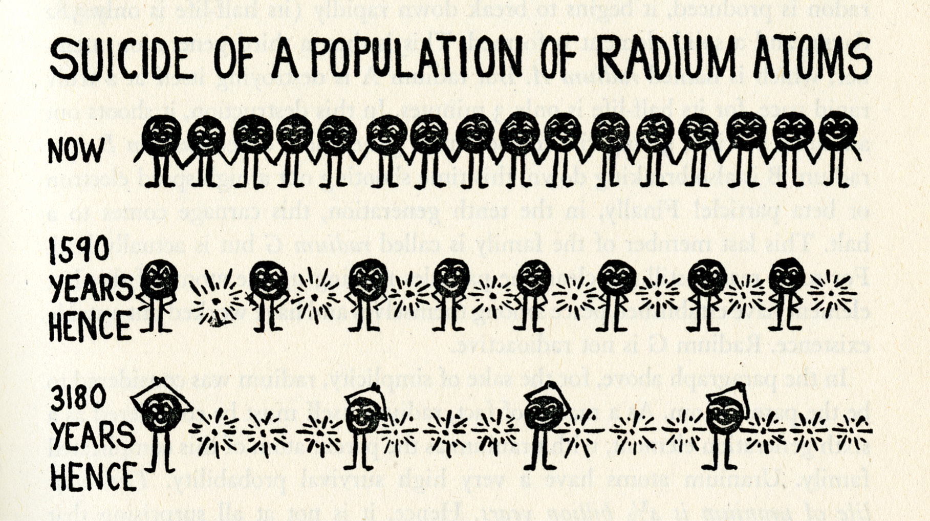 Sendak illustrates radioactive half-life by using radium. He shows the element’s atoms holding hands in the top row. After its half-life of 1590 years has passed, half the radium atoms remain, on average; after 3180 years, only a quarter of the atoms are intact. Sendak’s use of the word “suicide” in his caption is striking: The artist struggled with depression