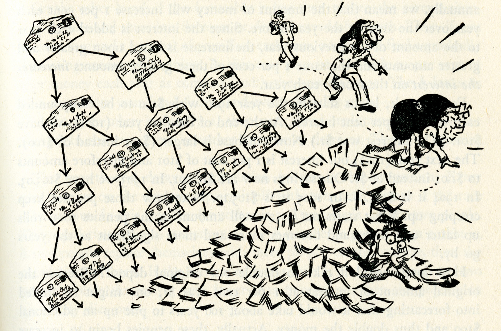 Long before the days of email, chain letters asking recipients to pass along a message to several others arrived in one’s physical mailbox. The authors use that common experience to explain chain reactions in nuclear reactors. In Sendak’s image, a chain letter begins multiplying and quickly buries a harried postal worker under a deluge of mail.
