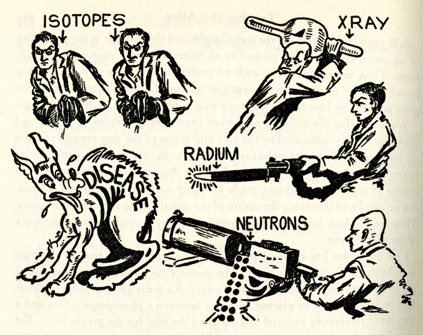 Sendak’s drawing for a chapter dedicated to the medical applications of synthetic isotopes echoes World War II–era military imagery. Medical practitioners attack a mangy dog labeled “disease” with what appear to be a neutron machine gun, a radium-tipped bayonet, an x-ray bludgeon, and isotope tommy guns.