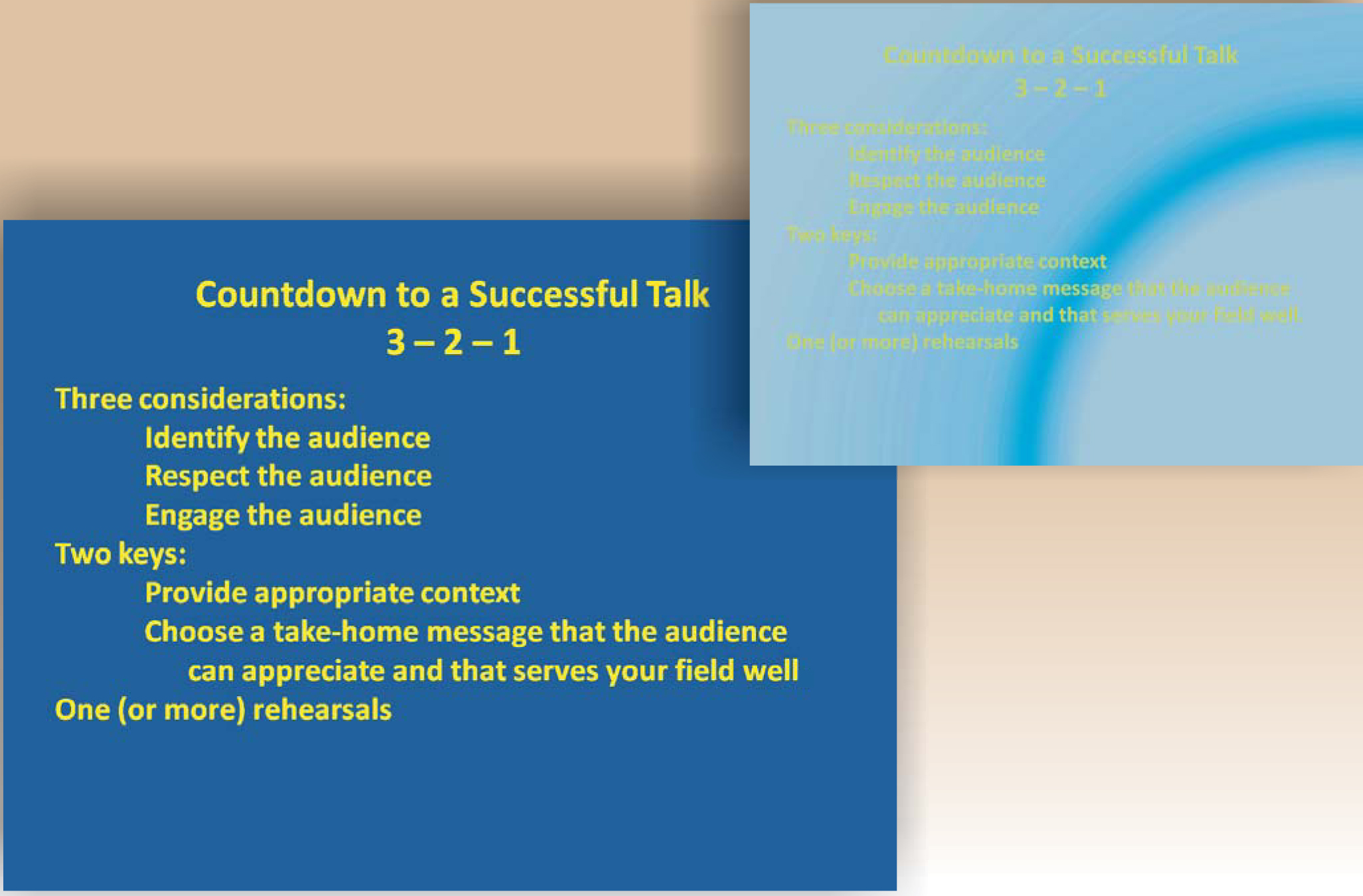 A rehearsal is essential. With a timer. Out loud—though I’ve done it under my breath on airplanes. If you are bashful, practice it by yourself. Far better, practice it in front of family or friends, preferably without telling them in advance what the talk is really about. See if they get it. If you are anything like me, the practice session will reveal some significant flaws—it runs too long, the take-home message is unclear, some piece of logic or storyline is missing or garbled, proper credit was not given to others, and on and on. A practice session is a golden opportunity to identify the problems and solve them. If you haven’t set the stage completely, add some more context. If there is extraneous material, get rid of it. If your message isn’t clear, sharpen it. If you stumble on a detail, rephrase or eliminate it. Practice pronouncing difficult words. If a slide is cluttered or muddled with poor colors, fix it. If your transition to audio or video is not seamless, streamline it. Then do another dry run. Are you now within your allotted time, proceeding smoothly from audience-specific context, through clear explanations of the details, to the desired conclusion? If not, another iteration is needed.