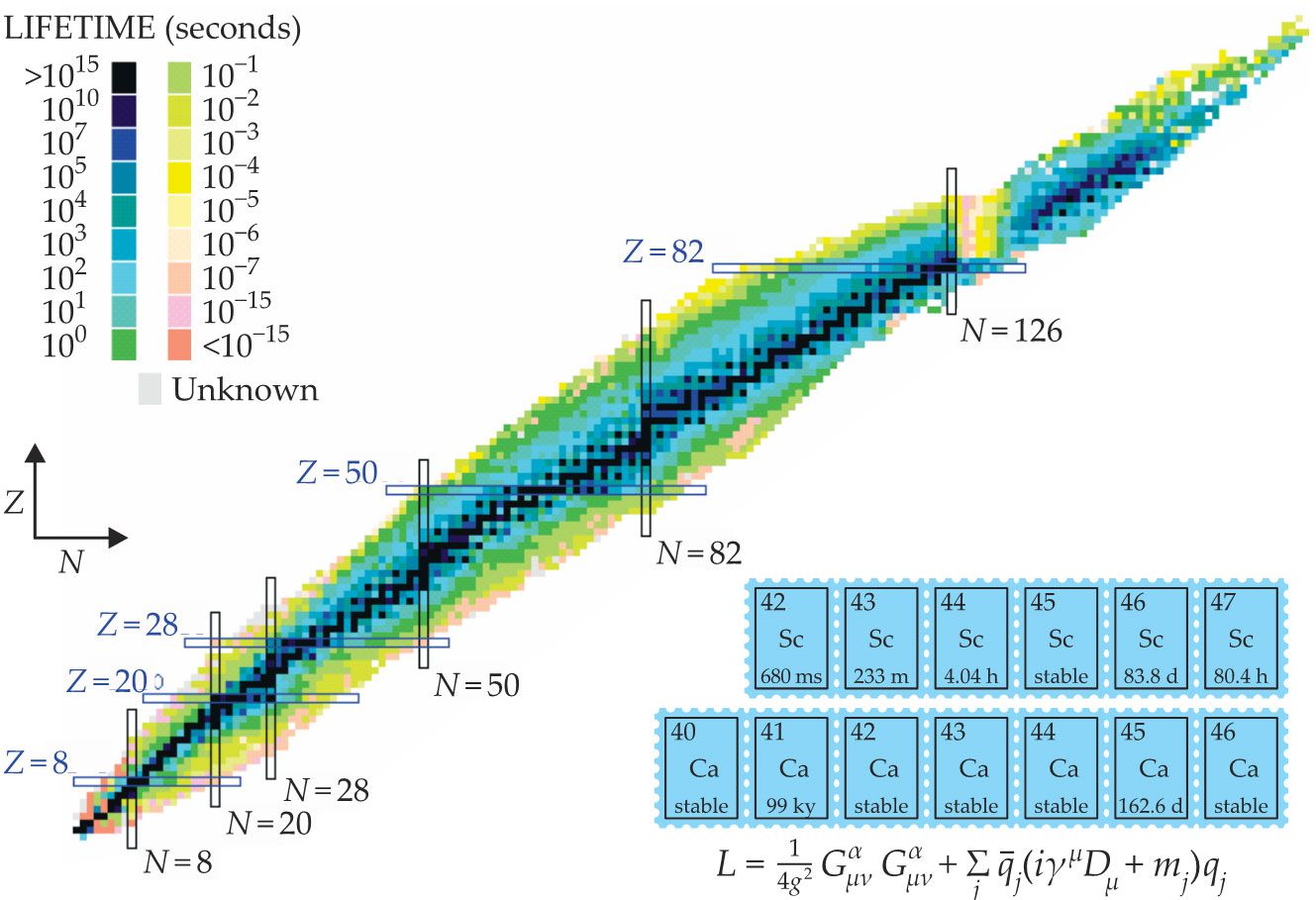 Nuclear chart of isotopes, plotted by atomic number Z and neutron number N and color coded according to the isotopes’ lifetimes. The inset shows a detail of the calcium and scandium isotopic chains. The nuclear force is a consequence of the quantum chromodynamic Lagrangian L. Identifying the patterns that emerge from the isotopic chains yields a deeper understanding of the nuclear force. (Image by Donna Padian.)