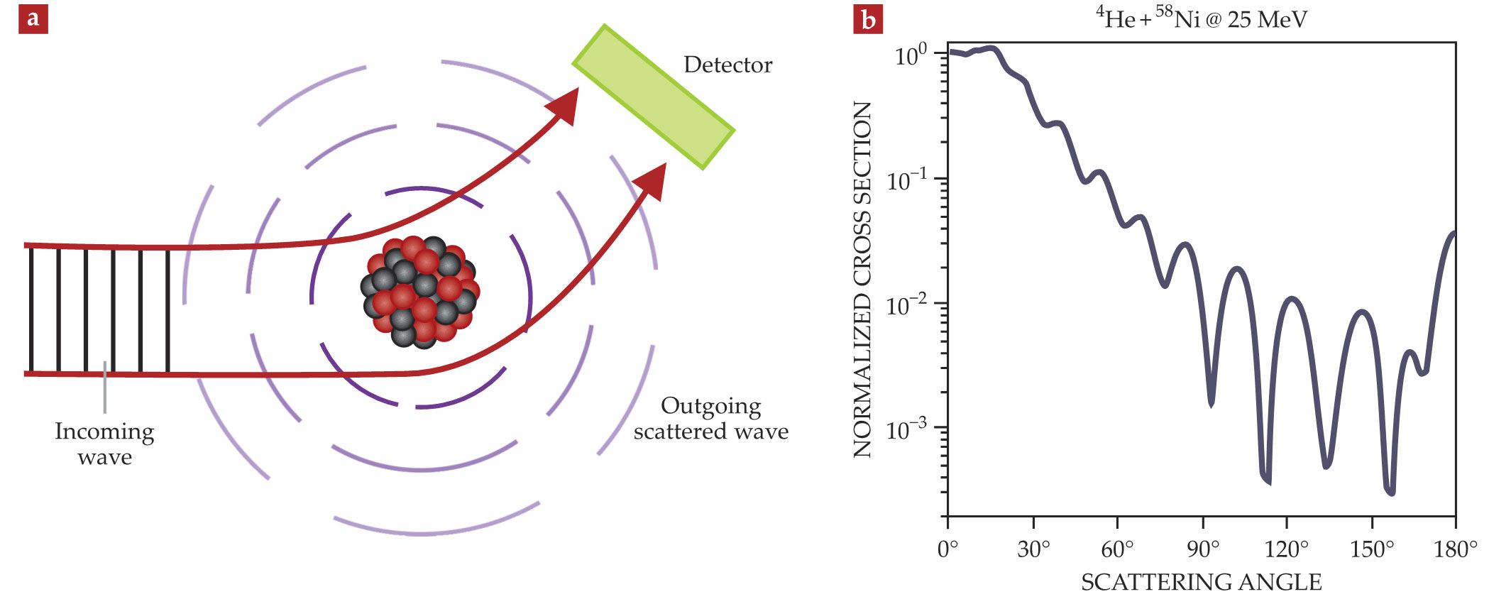 Elastic scattering of a nucleus off a target is best described using waves: (a) Part of the incoming beam is deflected on the near side of the target, whereas other parts are deflected on the far side. Because their paths differ, they have accumulated different phases by the time they reach the detector. (b) The result at the detector is an interference pattern that’s directly related to the size of the target nucleus. (Image by Donna Padian.)