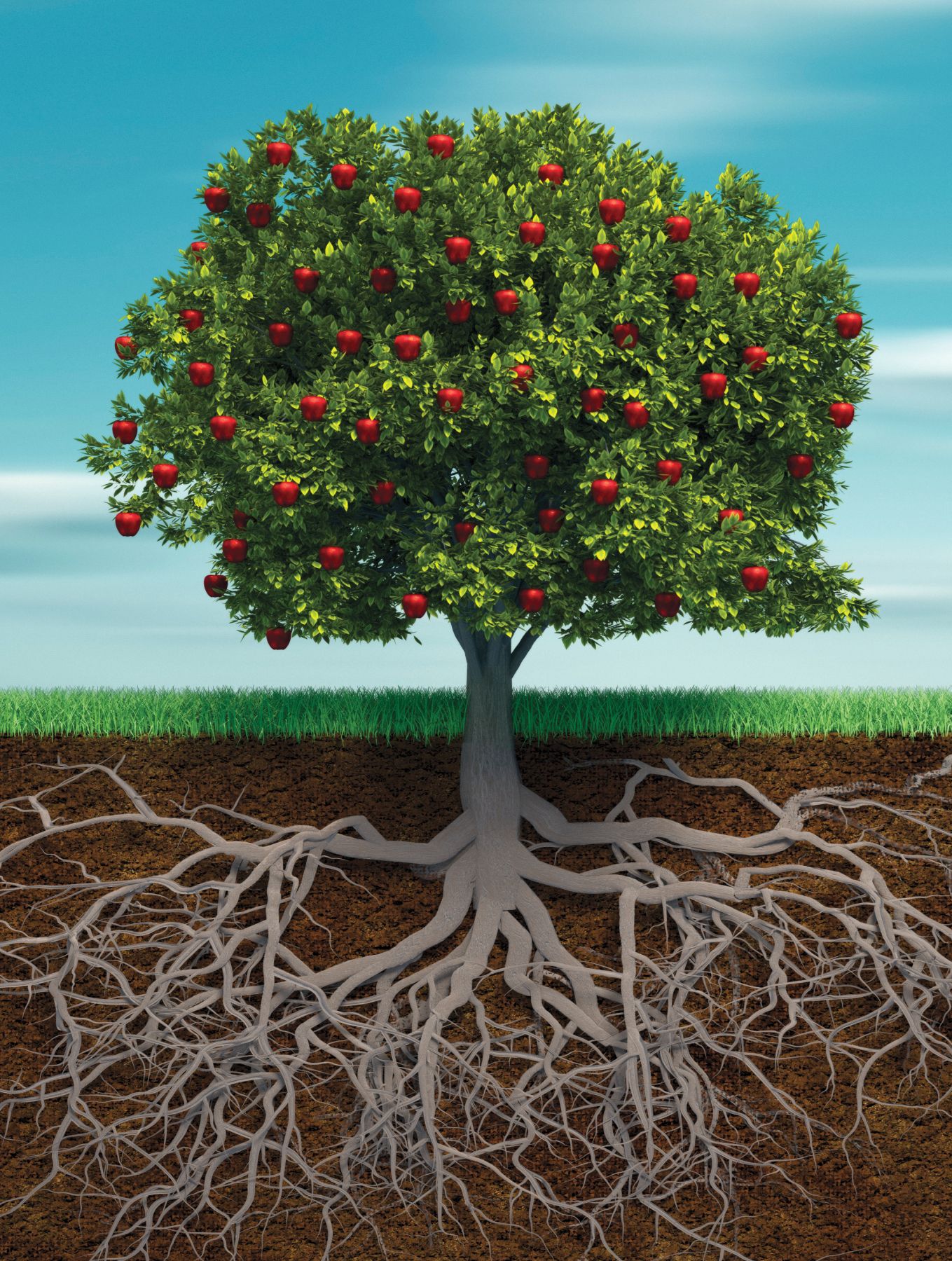 Quantum chromodynamics (QCD), that fundamental theory of the strong force, is represented here as the root system of a tree. Through effective-field theories for the nucleon–nucleon interaction (the tree’s trunk) and through many-body methods (its branches), nuclear theory can now connect QCD to the many nuclei nature produces (its fruits). (Image by Orla/Shutterstock.com.)