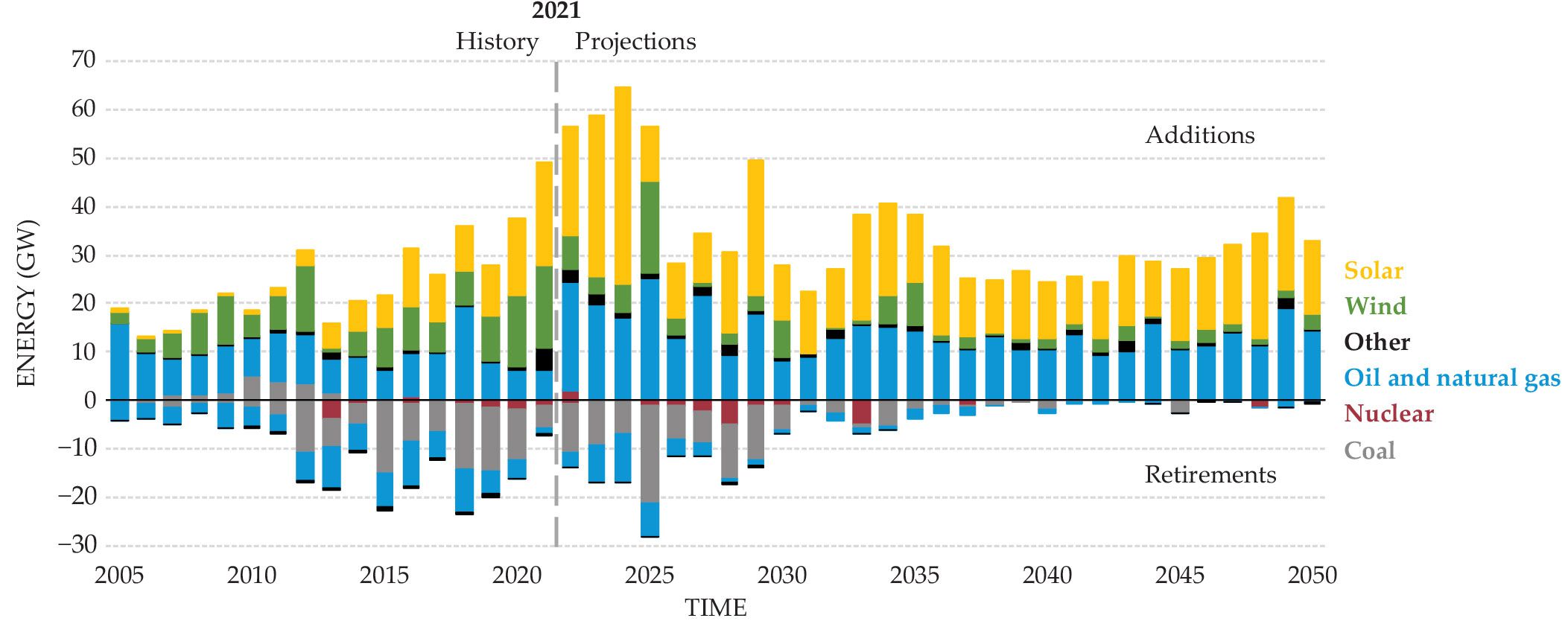 the US Energy Information Administration projected that planned nuclear power plant retirements across the US fleet will result in less total nuclear electricity generation capacity in 2050 than in 2020. Figure