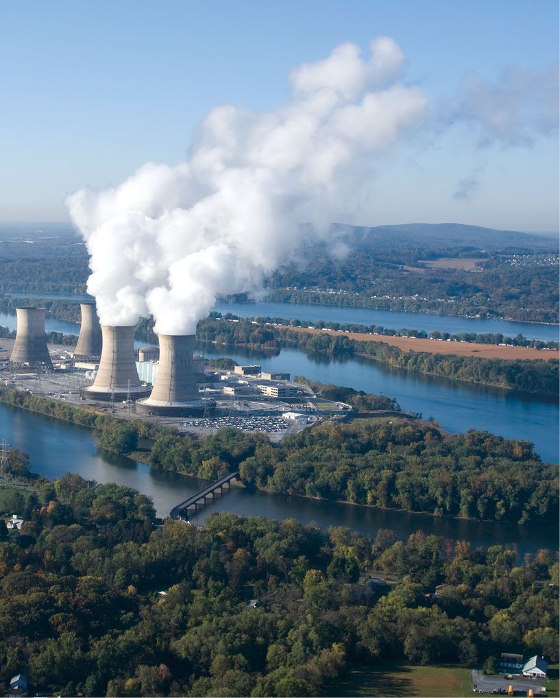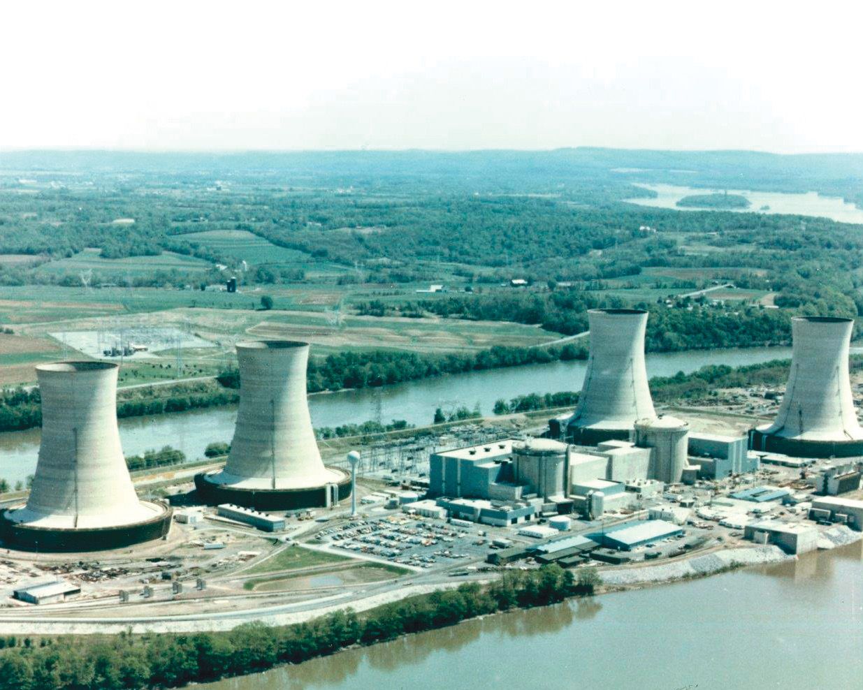 The cooling towers of Three Mile Island are shown here following the 1979 partial meltdown at Unit 2 (right). Unit 1 (left) was restarted in 1985. (Courtesy of NRC File Photo, CC BY-NC-ND 2.0