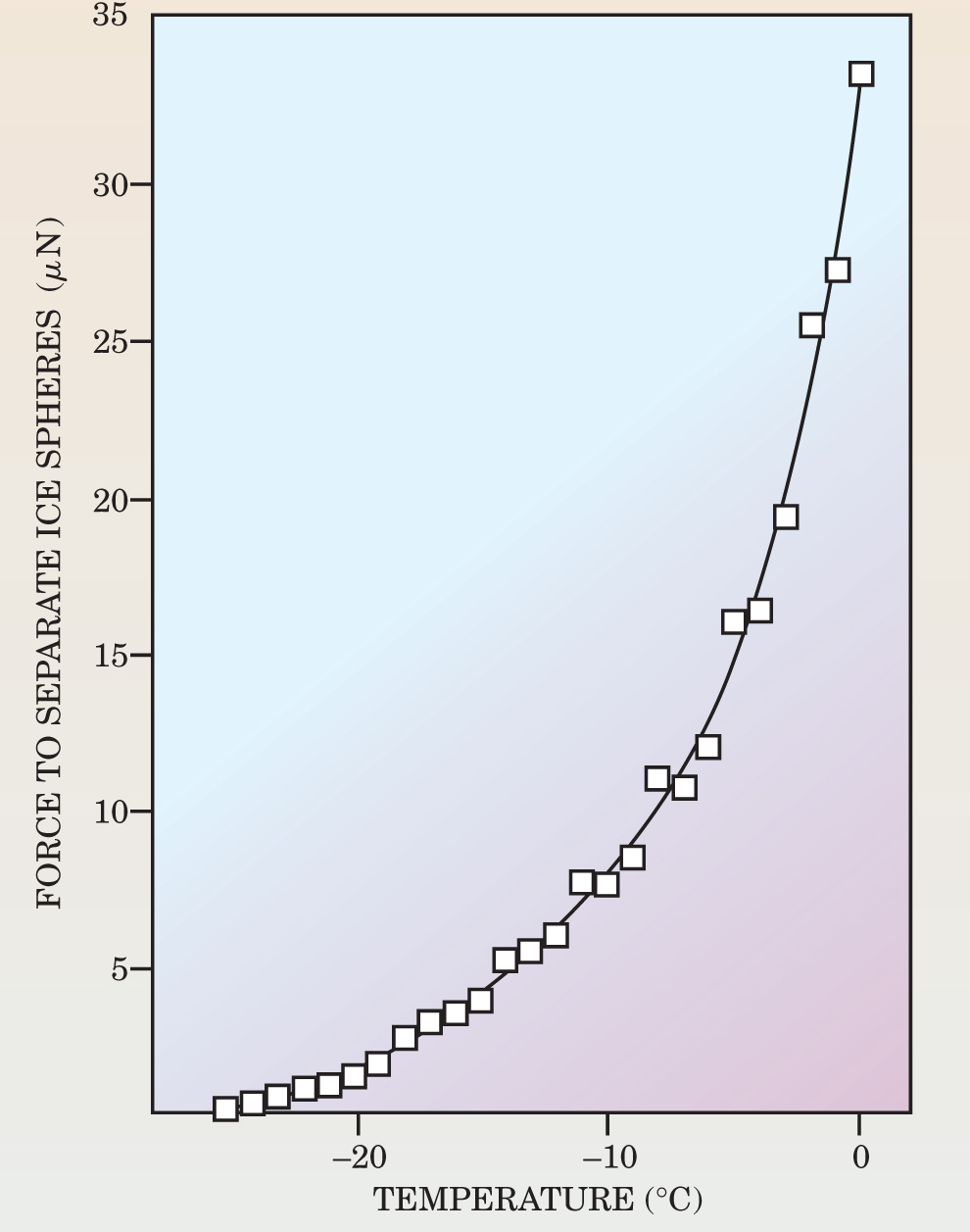 Figure 3. In a series of 1957 experiments, Charles Hosler and colleagues measured the force required to pull apart a pair of ice spheres in equilibrium and touching each other. The force increased as the temperature increased, an indication that warmer—though still subzero—temperatures form increasingly thick liquid-like layers on each sphere’s surface.
