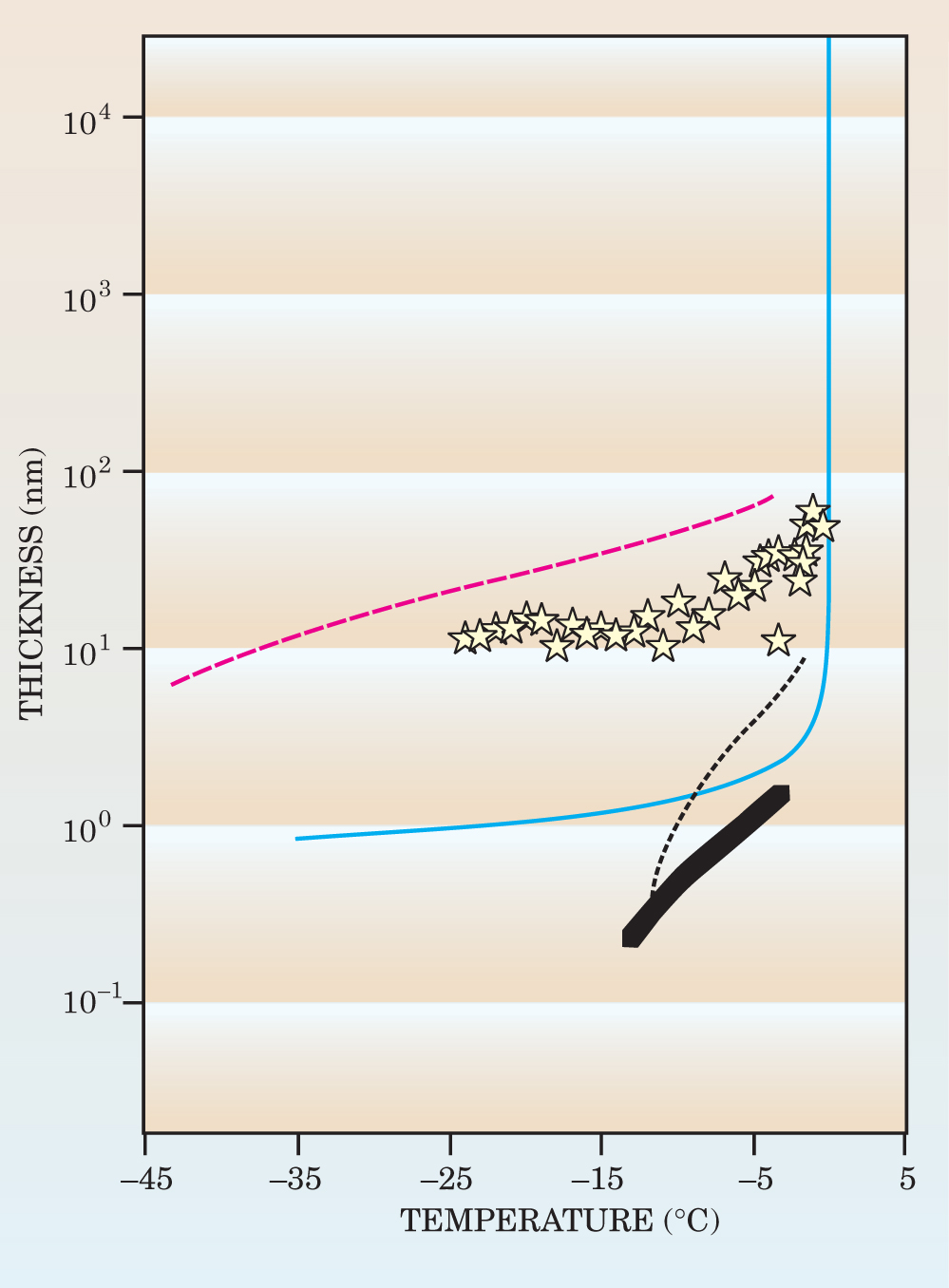 Since the mid-1960s, a variety of experimental approaches, performed under a variety of conditions, have been brought to bear on the premelting problem to determine the temperature range and thickness of any postulated layer. (For review of the literature on the topic up to that time, see reference .) Unfortunately, those different experimental conditions, ranging from high vacuum to the equilibrium vapor pressure of ice, make comparison between experimental results difficult (see figure 4).