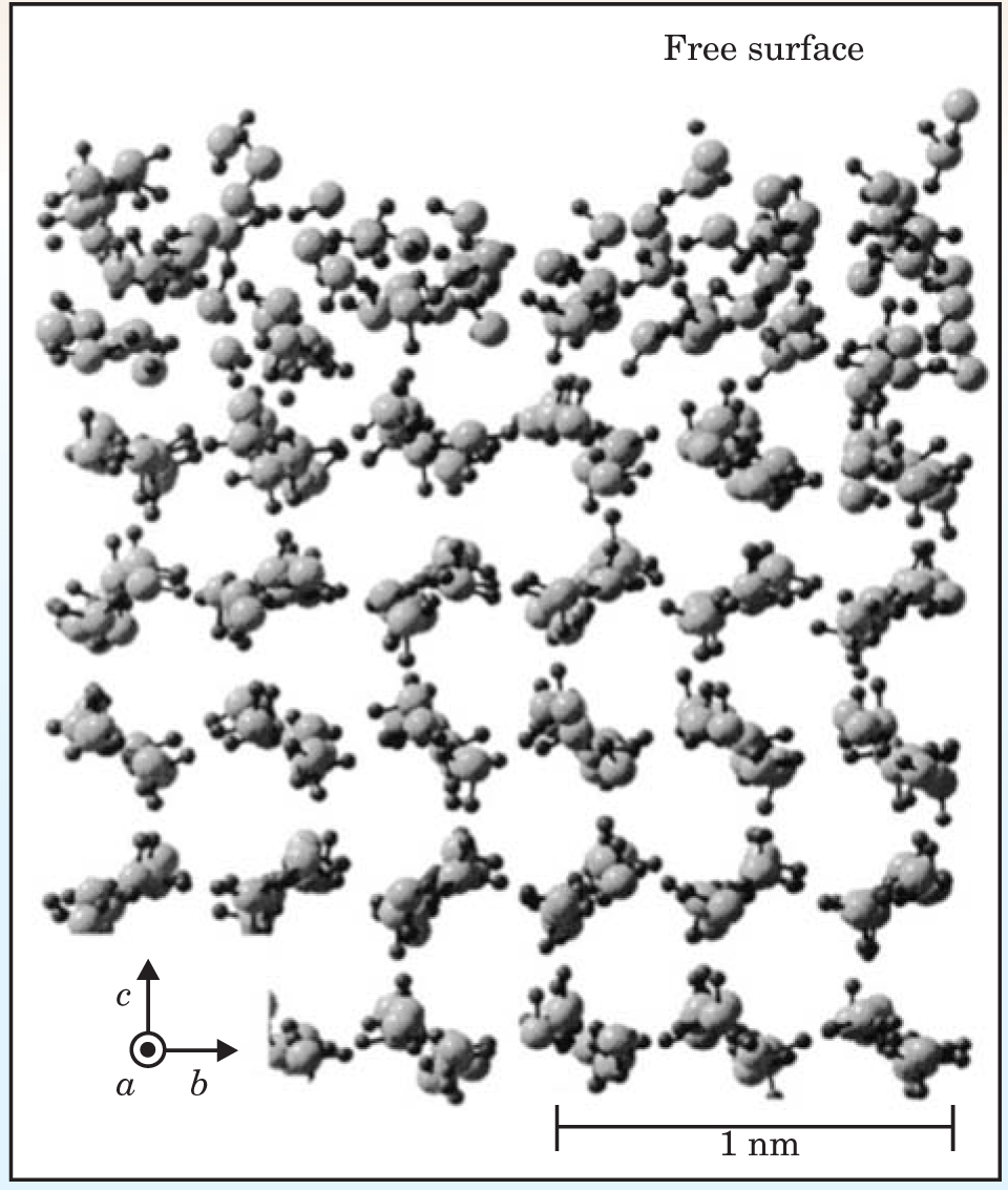 The nature of the liquid-like layer is not clear from experimental measurements, so theorists have tried to clarify the situation. In 2004 Tomoko Ikeda-Fukazawa (Japan Science and Technology Agency) and Katsuyuki Kawamura (Tokyo Institute of Technology) performed molecular dynamics simulations of the ice-Ih surface as a function of temperature.