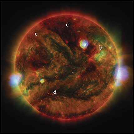 The x-ray Sun imaged by three space telescopes. This composite image of the Sun combines high-energy x rays (blue) imaged with the Nuclear Spectroscopic Telescope Array, low-energy x rays (green) imaged with the Japanese Hinode spacecraft, and extreme-UV spectra (yellow and red) imaged with the Solar Dynamics Observatory. The labels correspond to (a) a hot active region with a high concentration of looped magnetic field lines, (b) loops extending from one active region to another, (c) a cool x-ray dark hole over the Sun’s north pole where copious ions and electrons spew out along open magnetic field lines that don’t loop back down to the Sun, (d) small active regions called bright points, and (e) unresolved background. (Courtesy of NASA/JPL-Caltech/GSFC/JAXA.)
