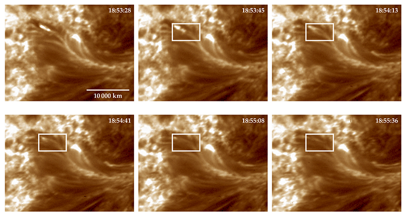Coronal magnetic threads imaged at 19.3 nm, at 0.2 arcsecond resolution, by the rocket-borne high-resolution coronal imager. The two-minute time series shows the unwinding of a braid of threads in the area inside the rectangle. (Adapted from ref.