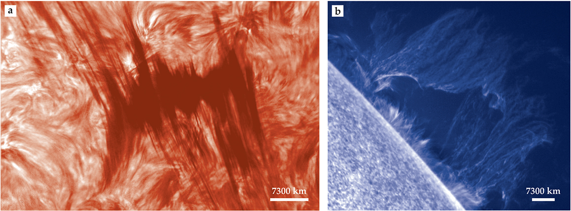 Quiescent solar prominences. (a) A high-resolution hydrogen Balmer-line (656.3 nm) image of a fragmented prominence was observed with the Swedish Solar Telescope on 22 August 2004. Viewed from above, a prominence is known as a filament. (b) A quiescent prominence, observed in the ionized calcium H line (396.8 nm) on 3 October 2007, was imaged with the solar optical telescope on board the Hinode satellite. (Panel a courtesy of the Swedish Solar Telescope; panel b adapted from A. Hillier et al., Astrophys. J. 756, 110, 2012, doi:10.1088/0004-637X/756/2/110