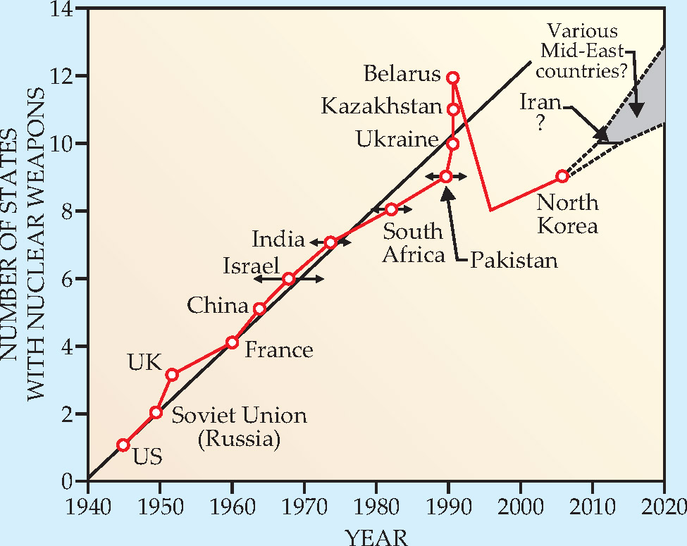 Figure 2. The number of nuclear weapons states grew for about 50 years at a rate of about one every five years (black line). When the Soviet Union was dissolved, Ukraine, Kazakhstan, and Belarus relinquished nuclear weapons from their territories; South Africa did as well. Despite that downward blip, the trend remains dangerously upward.