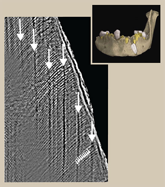 Figure 1. An x-ray tomographic reconstruction provides a three-dimensional picture of a material’s electron density. This image of one slice through such a reconstruction captures subtle density variations in the hard enamel of a living tooth—in this case, from the fossilized jaw of an ancient North African child (inset). The variations reveal periodic growth features known as Retzius lines (vertical arrows). The number of cross striations (small diagonal arrows)—daily accretions, each about 5 microns apart—between the Retzius lines provide an accurate record of the child’s age. (Adapted from ref.