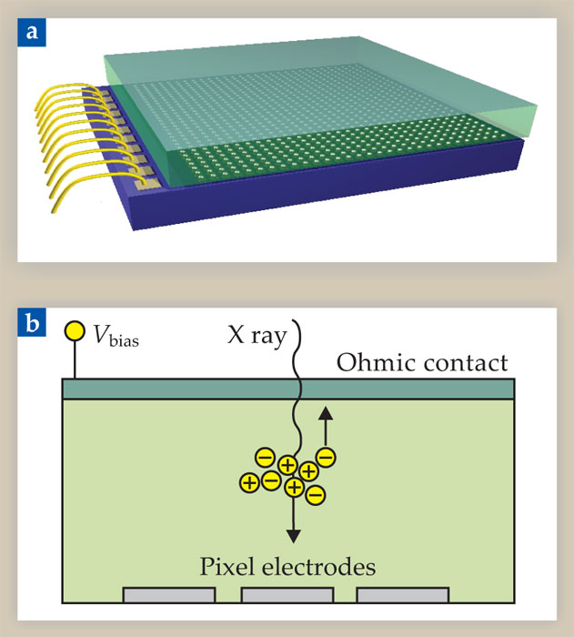 X rays are incident on the sensor layer, which may consist of a 500-µm-thick, high-resistivity silicon. Absorbed x rays create electrons and holes that, provided a bias voltage is applied, are swept apart along field lines to top and bottom electrodes. Each bottom electrode is connected to its own pixel of processing circuitry in the lower integrated-circuit layer. A single hybrid module of that sort may be a few centimeters across and contain tens of thousands of pixels. Modules are arranged side by side to tile larger detectors with up to several million pixels.