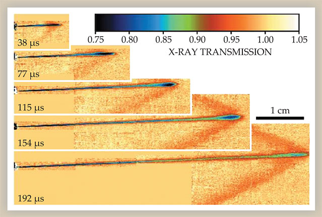 Figure 4. Time-resolved radiographic images of a high-pressure diesel-fuel spray, as captured by a pixel-array detector. The fuel is doped with a cerium-containing compound to enhance x-ray absorption contrast, shown here in false color. The tip of the fuel jet is supersonic, and the corresponding shock wave, indicated by the Mach cone of compressed gas emanating from the jet tip, is clearly visible (red). (Adapted from ref.