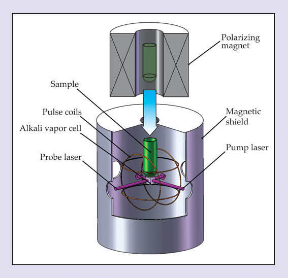 Figure 2. In the zero-field experiment depicted here, the sample (green) is initially polarized in a permanent magnet and then shuttled into a magnetically shielded region (bottom). A set of coils is used to null residual magnetic fields and to apply short magnetic field pulses, which excite coherences between the nuclear spin states and set into motion spin oscillations at the sample’s J-coupling frequency. Those oscillations are detected by an atomic magnetometer, whose key component is a cell containing a vapor of alkali atoms: A pump laser polarizes the atoms, and a probe laser detects their precession, from which one can infer the magnetic field due to the sample.