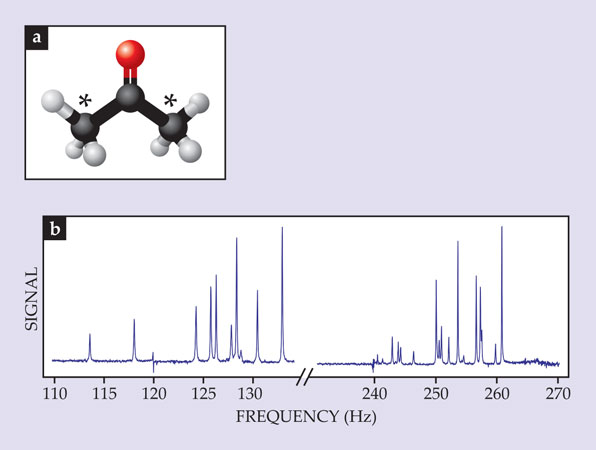 Figure 3. The zero-field spectrum of acetone doubly labeled with carbon-13. (a) The molecule’s nuclear spins reside in its side methyl groups: C atoms are shown in black (with 13C indicated by asterisks), hydrogen-1 is in white, and oxygen is in red. (b) The resulting spectral pattern is uniquely determined by the J-couplings within and between the methyl groups and yields a distinct molecular “fingerprint.”