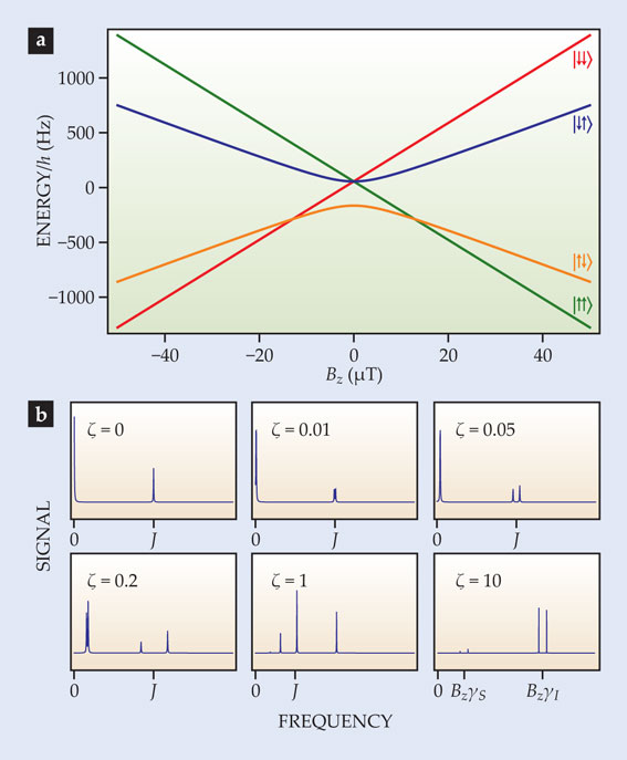 Although zero-field J-coupling spectroscopy can shed valuable light on a sample’s chemical makeup, even more information can be gleaned if a tiny, nanotesla magnetic field is applied. 10 To understand how, consider figure 4a, which shows energy levels as a function of magnetic field for a 13C–proton system with J-coupling frequency J = 220 Hz. In zero field, the triplet states are degenerate, separated in energy from the singlet state by hJ. A small field, however, lifts the degeneracy. As seen in figure 4b, the spectral line associated with the singlet-to-triplet transition splits into two, and the zero-frequency line associated with transitions between triplet states shifts upward and eventually splits. (In more complex molecules, the zero-field eigenstates span larger values of angular momentum and therefore lead to more complex splitting patterns.) When the magnetic field is sufficiently strong that the Zeeman effect is much larger than the J-coupling, the spectrum reduces to a set of two doublets, each split by J. Such near-zero-field splitting patterns can be used as a diagnostic tool to determine the types of transitions and degeneracies associated with zero-field NMR lines.