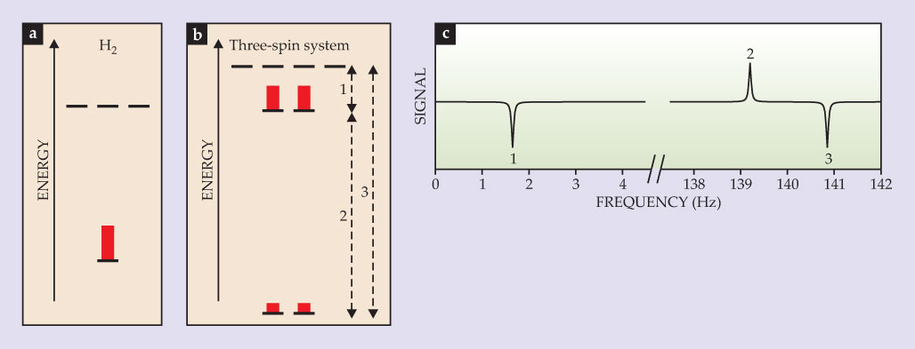 Figure 5. Parahydrogen-induced polarization can be used to obtain nuclear magnetic resonance signals in the absence of a magnetic field, as depicted here for a hypothetical three-spin system consisting of a carbon-13 nucleus and the nuclei of a parahydrogen molecule. (a) In isolation, the antiparallel spins in the parahydrogen molecule correspond to the singlet state. (b) If the molecule is catalytically added to a substrate molecule containing 13C, and if one of the C–H couplings is much stronger than the other couplings in the system, the symmetry of the parahydrogen spins is broken and in the newly formed three-spin system, the population of the upper doublet is about three times that of the lower one. (Here, we ignore the rotational energies that may be correlated with the nuclear state.) The horizontal lines represent magnetic sublevels and the red rectangles represent the expected populations in each sublevel. (c) The simulated spectrum of a system with strong C–H coupling JCH = 140 Hz, weak C–H coupling JCH = −5.2 Hz, and H–H coupling JHH = 7.7 Hz yields the three peaks shown here, which correspond to the three allowed transitions indicated by the dashed arrows in panel b.
